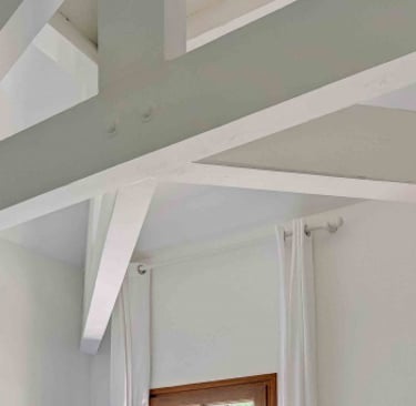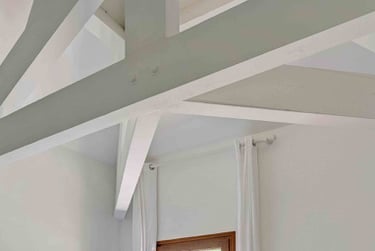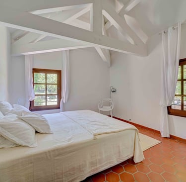 La chambre aux poutres : Cette grande chambre double située au premier étage, côté jardin, est absolument incroyable grâce à ses éléments en bois et en particulier sa structure de poutres apparentes. De plus, elle dispose d'un grand placard intégré. Des volets extérieurs sont présents pour garantir un sommeil paisible.