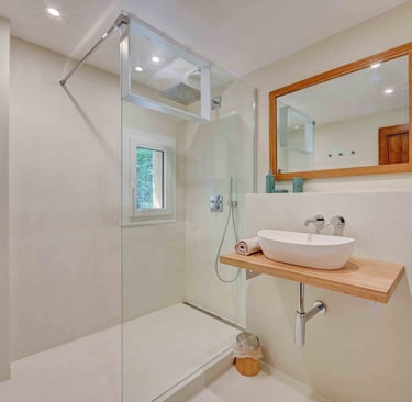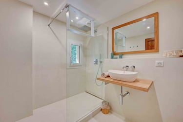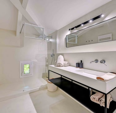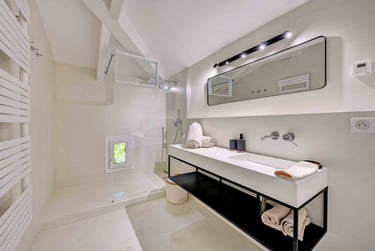 La salle d'eau en béton ciré et zellige blanc cassé, partagée avec la chambre 4, est en harmonie avec la chambre grâce aux rappels d'éléments en bois, et est pourvue d'un sèche serviettes, d'une fenêtre et d'un WC séparé.