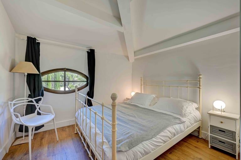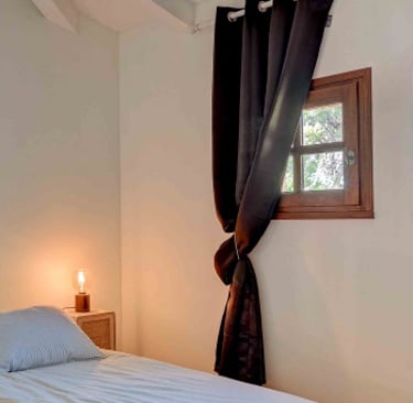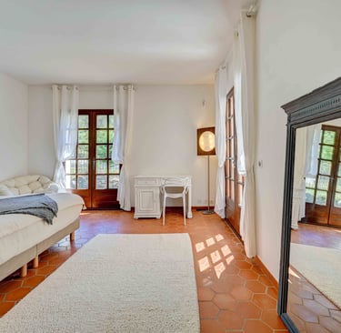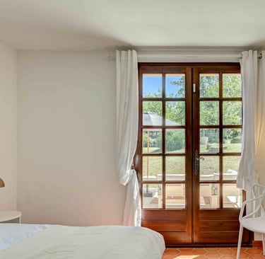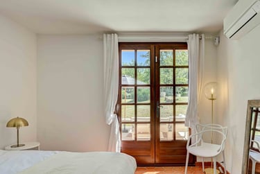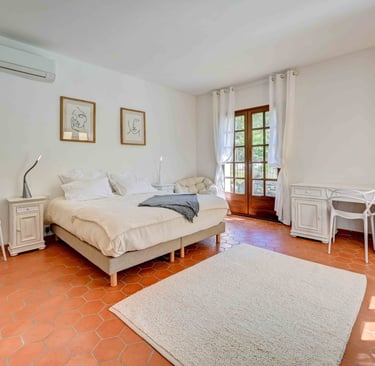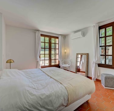 La chambre des parents : Cette suite parentale climatisée, située au rez-de-chaussée est très lumineuse. Elle possède un dressing et un placard, deux belles grandes portes fenêtres à la française agrémentées de rideaux en lin blanc avec un accès direct à la terrasse et le jardin. Des volets extérieurs sont présents pour garantir un sommeil paisible