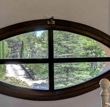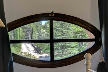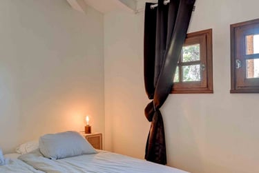 La chambre vue Ste Victoire : Cette belle chambre double située au premier étage, côté montagne, possède une vue fantastique sur la montagne Ste Victoire. Elle possède une structure de poutres apparentes et des tables de nuits en bois brut naturel. De plus, elle dispose d'un placard intégré et d'une commode. Pour garantir un sommeil paisible, la chambre est agrémentée de rideaux occultant anthracites