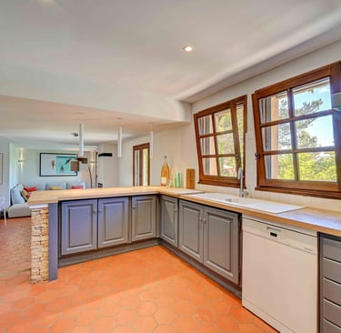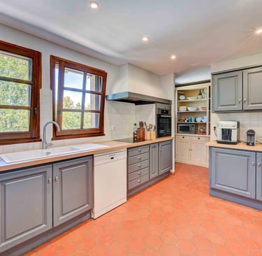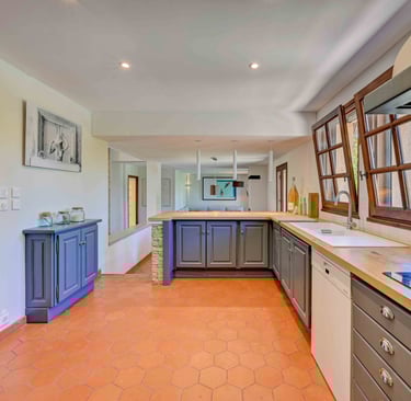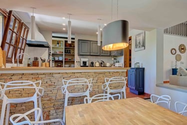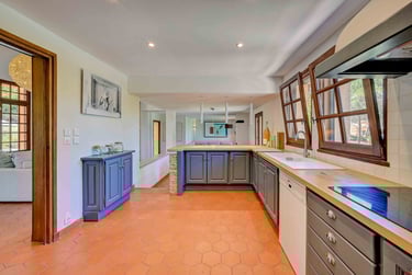 La cuisine hyper équipée est ouverte sur la salle à manger, ce qui permet une atmosphère conviviale et pratique. Elle est extrêmement pratique; avec un grand plan de travail; des espaces de rangement; offrant tous les outils nécessaires pour cuisiner.