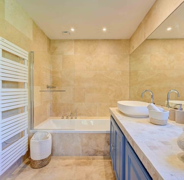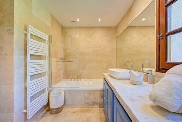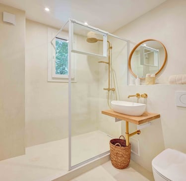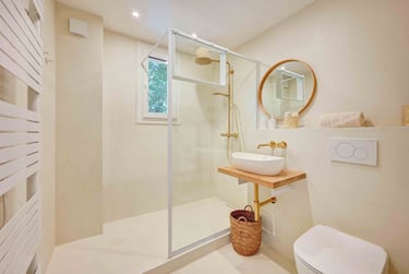 Sa salle d'eau en béton ciré et zellige blanc cassé est assortie à la chambre grâce à sa robinetterie dorée, et est pourvue d'un sèche serviettes, d'une fenêtre et d'un WC.