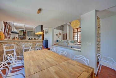 La salle à manger est équipée d'un bar comptoir donnant sur la cuisine. Elle est agrémentée d'une grande table en bois extensible pouvant accueillir de 4 à 10 personnes. Cet agencement permet de partager des repas conviviaux en famille ou entre amis. La table en bois apporte une touche chaleureuse à l'ensemble de la pièce, créant ainsi une ambiance accueillante et cosy. Que ce soit pour de simples dîners en tête-à-tête ou pour des occasions spéciales, cette salle à manger offre un espace pratique et fonctionnel pour recevoir et se réunir autour d'un bon repas.