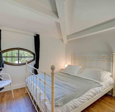 La chambre au hublot : Cette suite parentale climatisée est située au premier. La chambre est à la fois cosy et romantique, avec un beau lit ancien, des poutres apparentes et du parquet blond. Elle est également équipée d'un grand placard intégré. Pour garantir un sommeil paisible, la chambre est agrémentée de rideaux occultant anthracites,