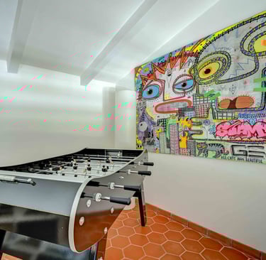 Quant au palier, il abrite un espace dédié à la lecture et aux jeux. Une bibliothèque bien fournie attend les amateurs de littérature et BD, tandis que les passionnés de jeux de société en tout genre (scrabble, jeux d'échecs, tarot, ... pourront s'amuser en famille ou entre amis. Et pour les plus compétitifs, un véritable baby-foot René Pierre est également à disposition.